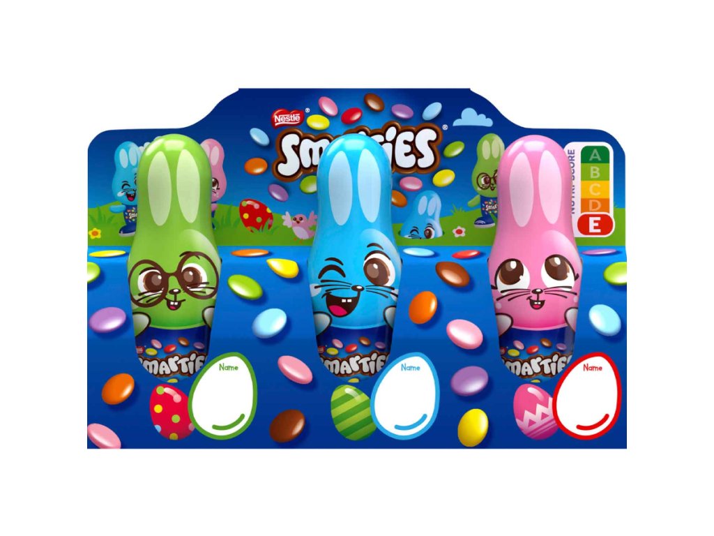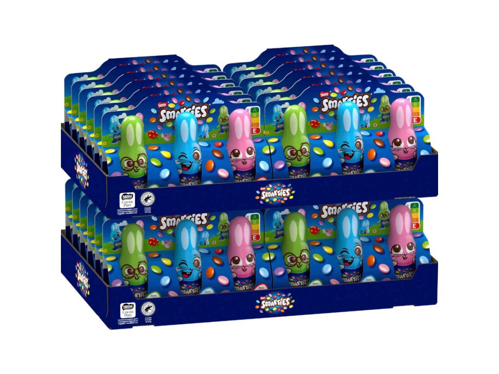 Hledáte milý a hravý velikonoční dárek, který vykouzlí úsměv na tváři dětem i dospělým? S veselými zajíčky Smarties rozhodně nešlápnete vedle! V balení najdete tři rozkošné mini zajíčky z jemné mléčné čokolády, kteří ukrývají oblíbené křupavé čokoládové čočky Smarties. Každý zajíček má jinou barvu a výraz a celé balení je navrženo tak, aby potěšilo na první pohled. Skvělé do velikonočního košíku, jako malá pozornost nebo radost jen tak – barevné, veselé, chutné.