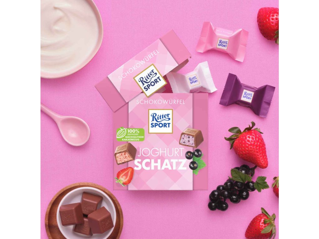 Ritter Sport přináší to nejlepší ze světa čokolád a svěžích náplní. Krémová konzistence náplní s jemně nakyslou chutí jogurtu a ovocnými tóny vytváří perfektní rovnováhu s plnou chutí kvalitní mléčné čokolády. Každá kostka je poctivě vyrobena v Německu z kakaa s certifikací Rainforest Alliance a surovin té nejvyšší kvality. Výsledkem je čokoláda, která není těžká ani přeslazená, ale osvěžující, jemná a neodolatelně návyková.