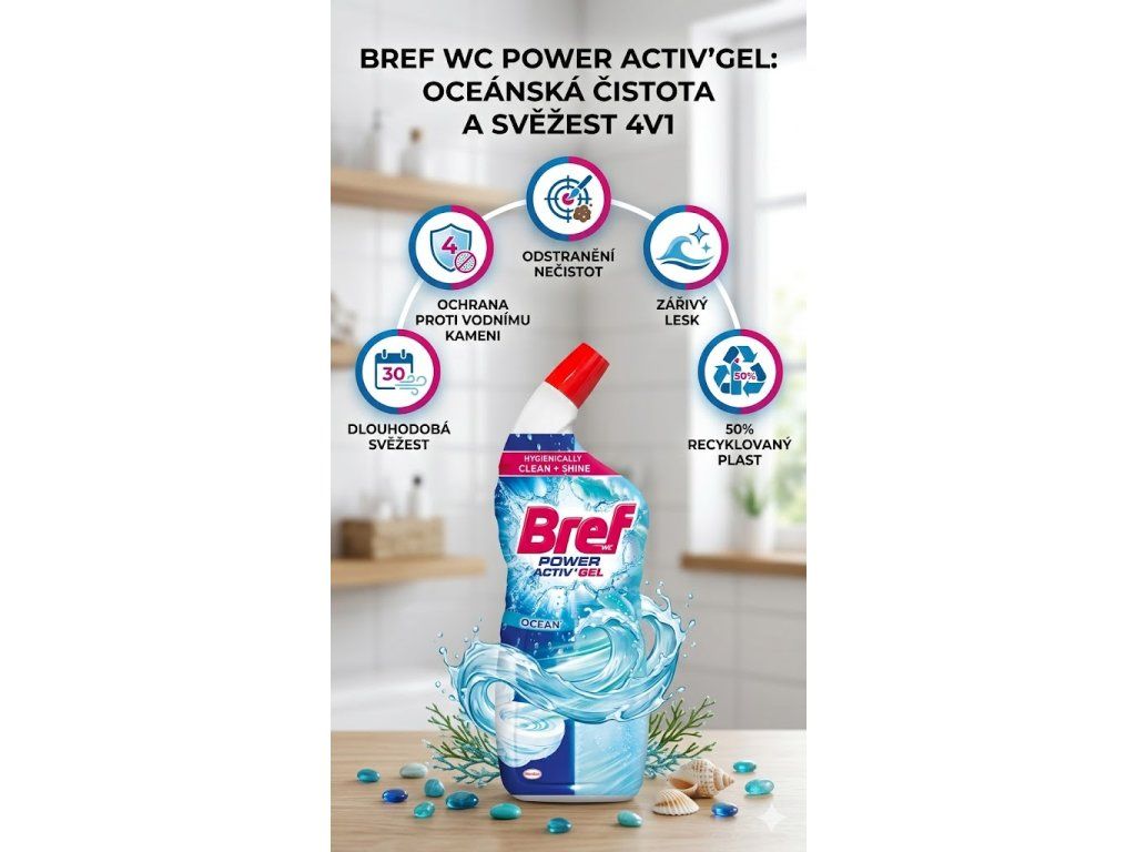 Přejete si mít toaletu, která je nejen dokonale čistá, ale zároveň i dlouhodobě svěže provoněná? S čisticím gelem Bref WC Power Active Ocean proměníte běžný úklid v rychlou a efektivní péči, která přináší viditelné i voňavé výsledky. Tento silný pomocník si poradí s vodním kamenem, nečistotami i nepříjemnými pachy a zanechá po sobě zářivý lesk a osvěžující oceánskou vůni, která vydrží dlouho po spláchnutí. Přesně ten pocit čistoty, který chcete ve své domácnosti zažívat každý den.