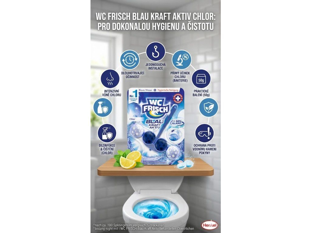 WC Frisch Blau Kraft Aktiv Chlor závěsný blok 50g je inovativní toaletní doplněk navržený pro účinnou dezinfekci a osvěžení toalety. Tento závěsný blok kombinuje čisticí schopnosti s dezinfekčními vlastnostmi chloru, což poskytuje výkonnou ochranu proti bakteriím a nepříjemným zápachům.