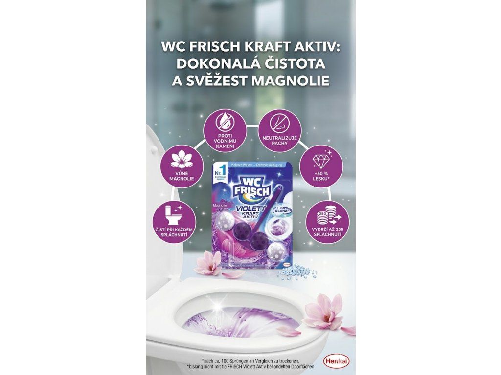 Přejete si, aby vaše toaleta byla nejen dokonale čistá, ale zároveň i příjemně provoněná při každém spláchnutí? WC Frisch Kraft Aktiv Magnolie je řešení, které kombinuje účinné čištění, ochranu a dlouhotrvající svěžest v jednom praktickém produktu. Elegantní květinová vůně magnolie promění každou návštěvu toalety v příjemný zážitek, zatímco aktivní složky pracují na tom, aby vaše WC zůstalo hygienicky čisté a bez zápachu. Jednoduché použití, maximální efekt – přesně to, co moderní domácnost potřebuje.
