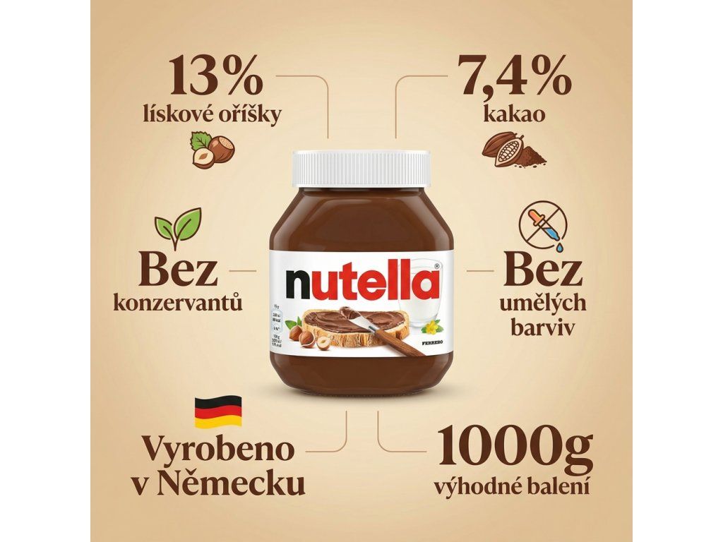 Nutella je originální lískooříšková pomazánka s kakaem, jejíž receptura vznikla v Itálii a nyní se vyrábí i v Německu. Obsahuje 13 % lískových oříšků, 8,7 % sušeného mléka a 7,4 % kakaa, což jí dodává nezaměnitelnou chuť. Krémová konzistence se snadno roztírá a její jemná vůně a sladká, oříšková chuť z ní dělají nepostradatelný prvek každého snídaňového stolu. Nutella je skvělá nejen na chleba, ale také jako ingredience do dortů, muffinů, dezertních krémů nebo jen tak na lžičku.