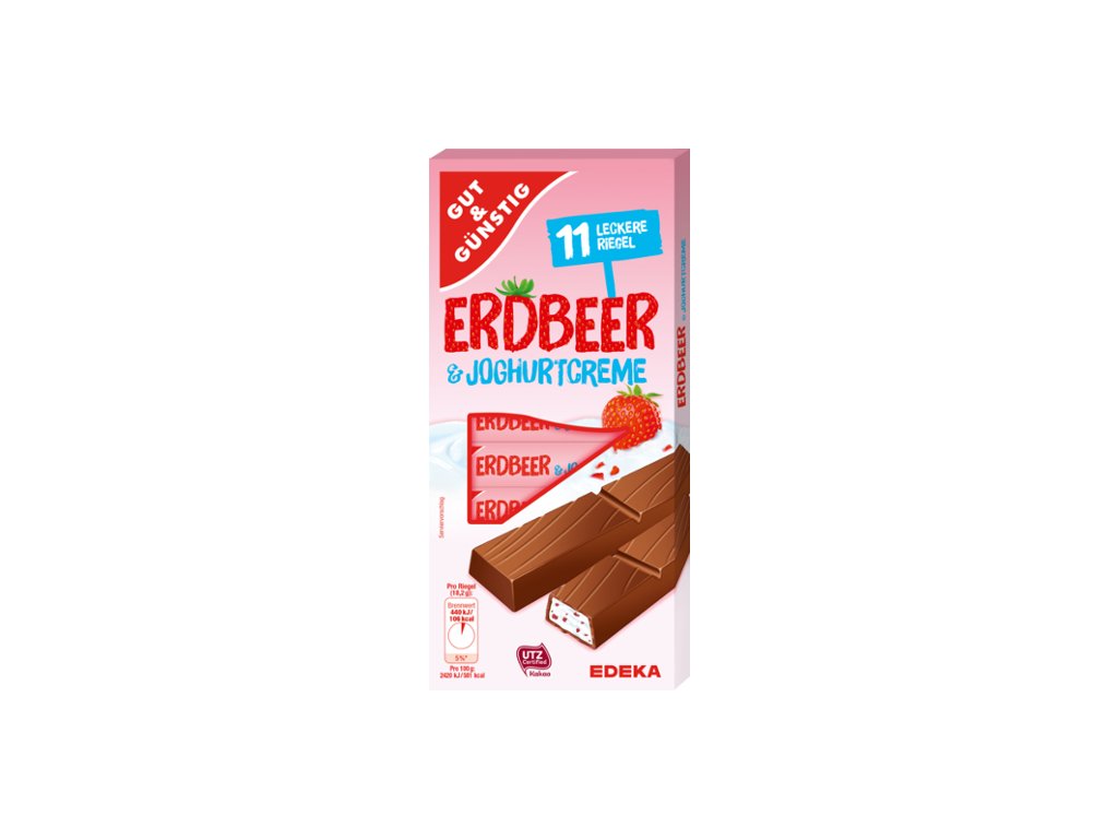 Máte chuť na něco sladkého, krémového a zároveň svěžího? Jogurtovo-jahodové tyčinky GUT&GÜNSTIG vás nadchnou svou jemnou mléčnou čokoládou a bohatou náplní z jogurtu a jahod. Každá tyčinka ukrývá 50 % krémové jahodovo-jogurtové náplně, kterou doplňují křupavé jahodové kousky pro ještě zajímavější chuťový zážitek. Díky praktickému balení po 11 kouscích máte jistotu, že si je můžete vychutnat kdykoliv během dne – doma, v práci nebo na cestách.