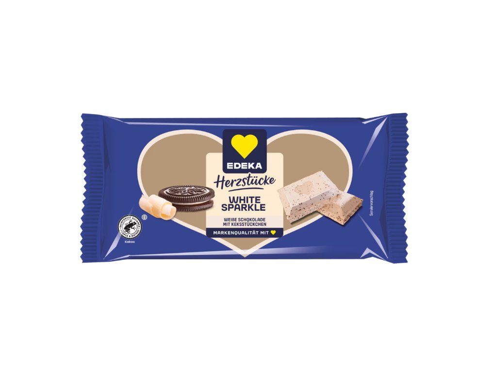 Máte rádi bílou čokoládu, ale chcete v ní něco navíc? EDEKA Herzstücke White Sparkle přináší dokonale krémovou bílou čokoládu obohacenou o kakaové sušenkové kousky, které dodávají každému soustu jemnou křupavost a lehce kakaový kontrast. Hladká sladkost bílé čokolády se potkává s drobnými kousky sušenek a vytváří chuťový zážitek, který je zároveň jemný i hravý. Ideální sladká tečka ke kávě, odpolední odměna nebo malá radost pro chvíle, kdy si chcete dopřát něco výjimečného.