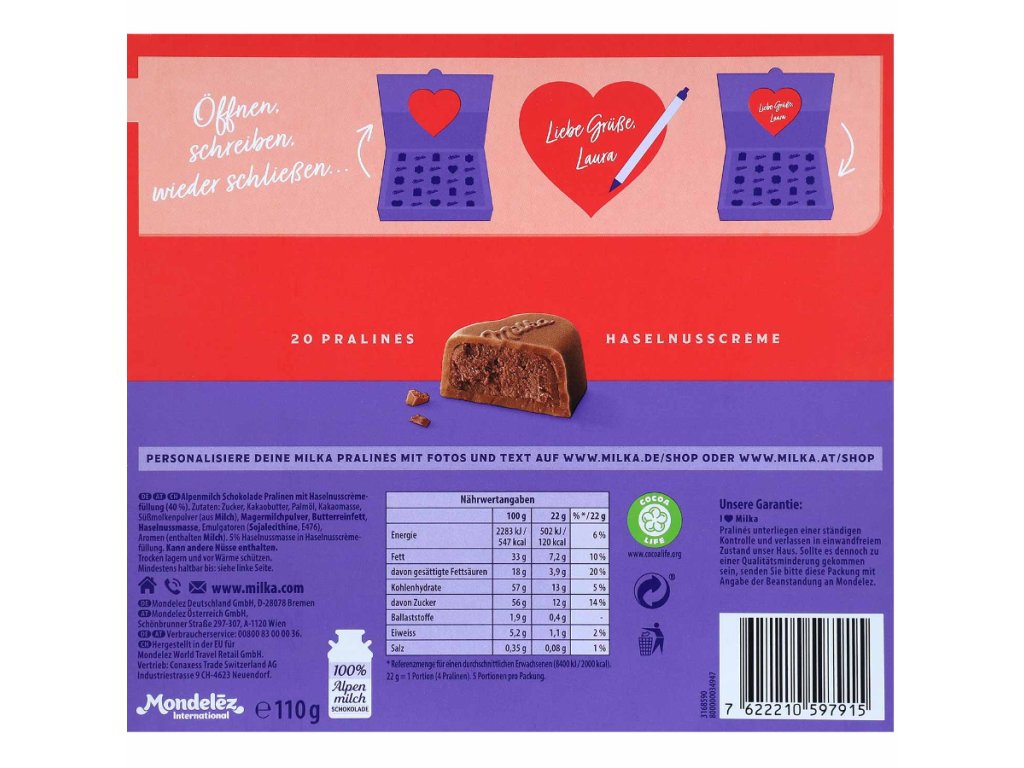 Chcete někomu vyjádřit své city sladkým a vkusným způsobem? Pralinky Milka „I ♥ Milka“ jsou tím pravým poslem emocí. Dárková krabička v elegantní kombinaci červené a fialové barvy skrývá 20 pralinek ve tvaru srdce z jemné alpské mléčné čokolády, které ukrývají sametově hladkou lískooříškovou náplň (40 %). Ideální jako romantický dárek, malá pozornost ke Dni matek nebo pro všechny, na kterých vám záleží.