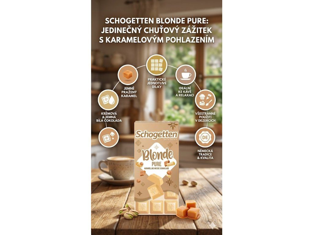 Dopřejte si jemnou bílou čokoládu s karamelovým tónem, která se rozplývá na jazyku. Schogetten Blonde Pure nabízí krémovou chuť, praktické dílky a dokonalý požitek ke kávě i jen tak.