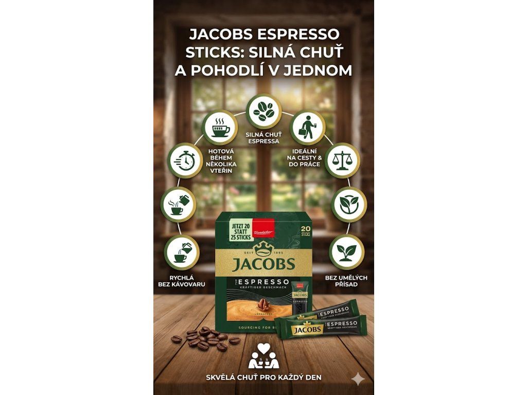 Jacobs Espresso Sticks přináší intenzivní, plnou a bohatou chuť, kterou si snadno vychutnáte kdykoliv – doma, na cestách i v kanceláři. Porcované sáčky zajišťují maximální čerstvost každé dávky a jednoduché použití – bez nutnosti odměřování, bez odpadu, bez stresu. Tato rozpustná káva je ideální i pro ty, kdo si chtějí dát kvalitní kávu během několika vteřin. Ať už ráno spěcháte, nebo potřebujete rychlý restart během náročného dne, tento malý sáček dokáže velké věci.