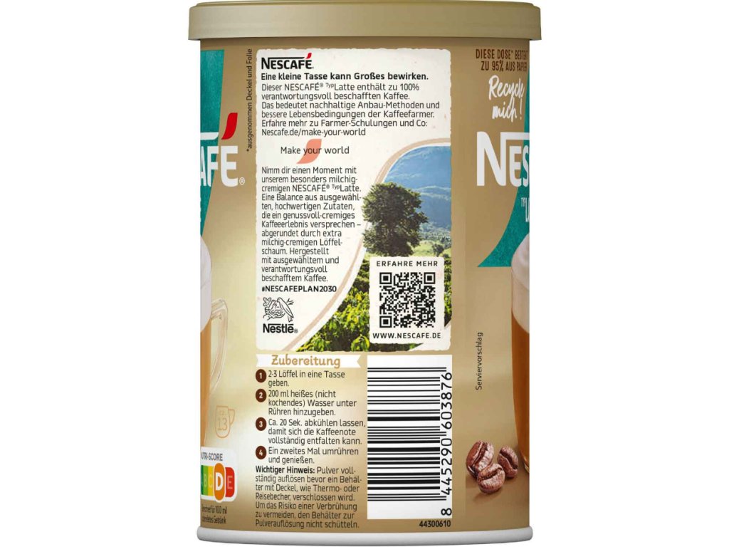 Použití: Pro přípravu latte dejte 3–4 čajové lžičky prášku Nescafé Typ Latte do šálku, přidejte 150 ml horké, ale ne vařící vody, nechte nápoj 20 sekund odstát a poté důkladně promíchejte. Vychutnejte si jemnou pěnu a plnou chuť kávy.