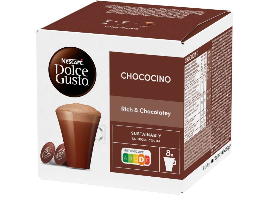 Chococino je horký nápoj vyrobený z kvalitního kakaa a plnotučného mléka. V balení najdete 8 kapslí s čokoládovým práškem a 8 kapslí s mlékem, které dohromady vytvoří nápoj s jemně nasládlou chutí, krémovou texturou a voňavou čokoládovou pěnou. Výsledkem je dokonalá alternativa ke klasické horké čokoládě, připravená během minuty pomocí kávovaru Dolce Gusto.
