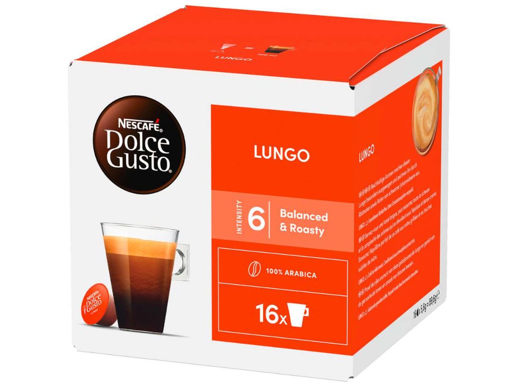Máte rádi kávu, která není ani příliš silná, ani slabá – prostě tak akorát? Nescafé Dolce Gusto Lungo vám nabídne dokonale vyvážený šálek středně silné kávy s jemnou ovocnou linkou a plnou vůní. Slovo „lungo“ znamená v italštině „dlouhý“, a právě takový je i tento nápoj – delší než espresso, ale s podobnou intenzitou. Z jedné kapsle připravíte až 120 ml lahodné kávy ideální na pohodové ráno nebo příjemnou pauzu během dne. Vyrobeno ze 100% prémiové Arabiky z ekologicky a sociálně odpovědných farem.