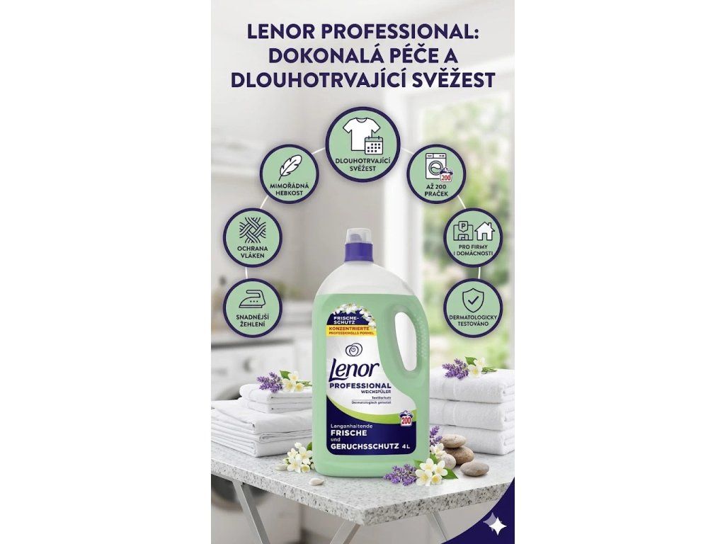 Lenor Professional aviváž pro dlouhotrvající svěžest 4 l (200 praní) nabízí mimořádnou jemnost, ochranu vláken a osvěžující vůni, kterou ocení každý – ať už jde o rodinu, hosty v hotelu nebo klienty v péči. Spolehlivý partner pro každé praní.