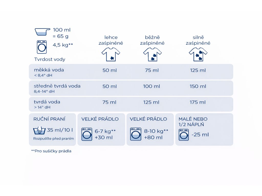 - Ideální dávkování závisí na tvrdosti vody a míře znečištění (viz obal)