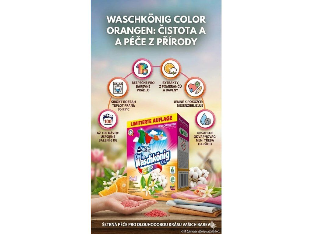 Waschkönig Color prášek s výtažky extraktu z pomerančů a bavlny je prací prostředek navržen speciálně pro barevné prádlo, který kombinuje účinné čištění s přírodními výtažky pro osvěžení a péči o textilie. Tento produkt slibuje zachování barvy a vůně vašeho barevného prádla. Zde je podrobný popis tohoto produktu: