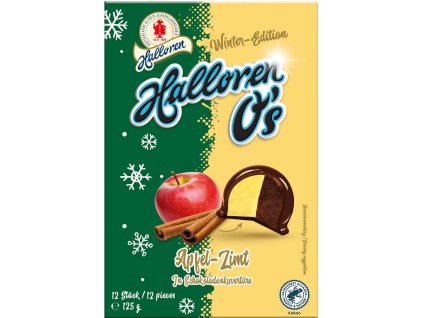 Halloren O's Apfel-Zimt – pralinky s jablečno-skořicovou náplní a hořkou čokoládou s 60 % kakaa. 12 kuliček, plná...