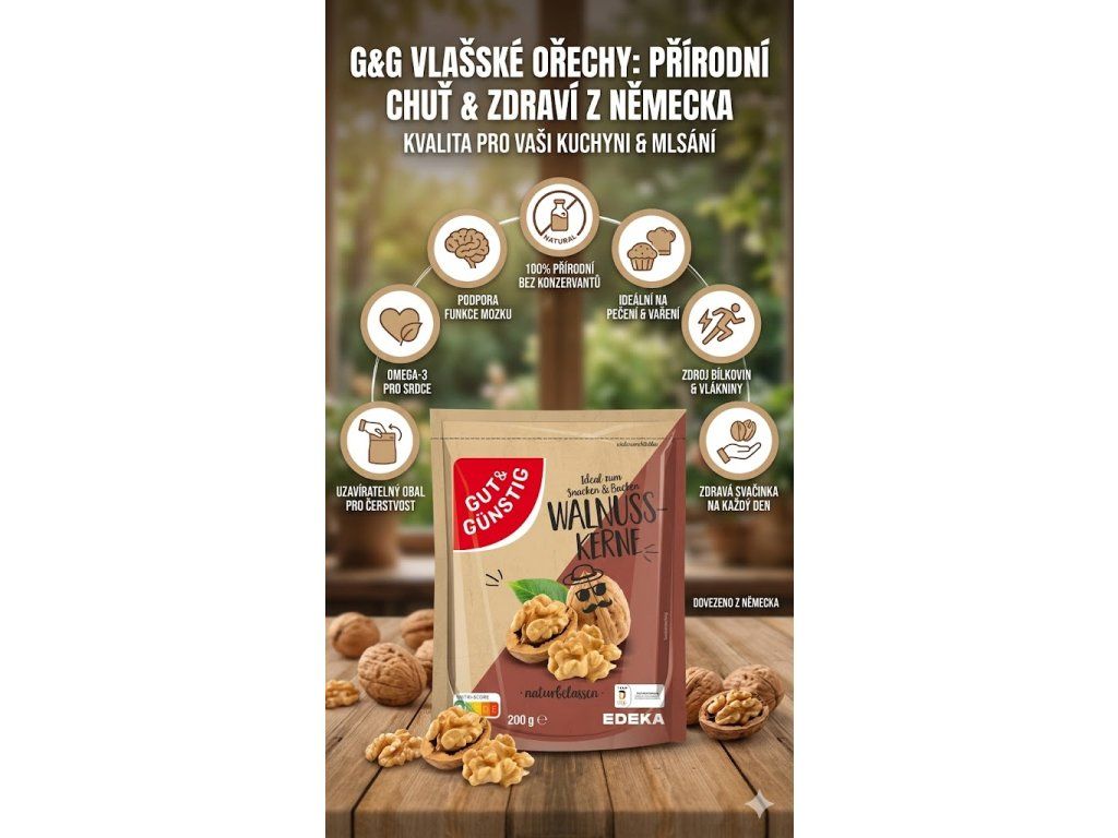 G&G Vlašské ořechy jsou kvalitní, přírodně nezpracované ořechy, které přinášejí bohatou a jemně sladkou chuť. Ideální jako zdravá svačinka, obohacení jídelníčku nebo přísada do vašich oblíbených receptů. Balení o hmotnosti 200 g je vybaveno praktickým uzavíratelným obalem, který udržuje ořechy čerstvé a chrání je před vlhkostí, což zajišťuje delší trvanlivost a pohodlné skladování.