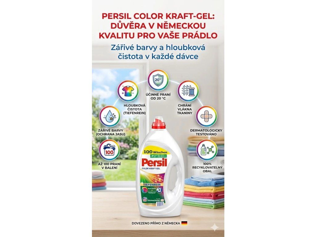 Vaše barevné prádlo si zaslouží tu nejlepší péči – a tu přesně nabízí Persil Color Kraft-Gel Tiefenrein. Tento prémiový prací gel z Německa byl navržen tak, aby účinně odstranil i ty nejodolnější skvrny, a přitom maximálně chránil barvy i strukturu vláken. Díky hloubkovému účinku proniká do tkaniny a zanechává ji hygienicky čistou, svěží a příjemně provoněnou. Až 100 pracích dávek – pro dlouhodobou úsporu a spolehlivý výsledek každé praní.