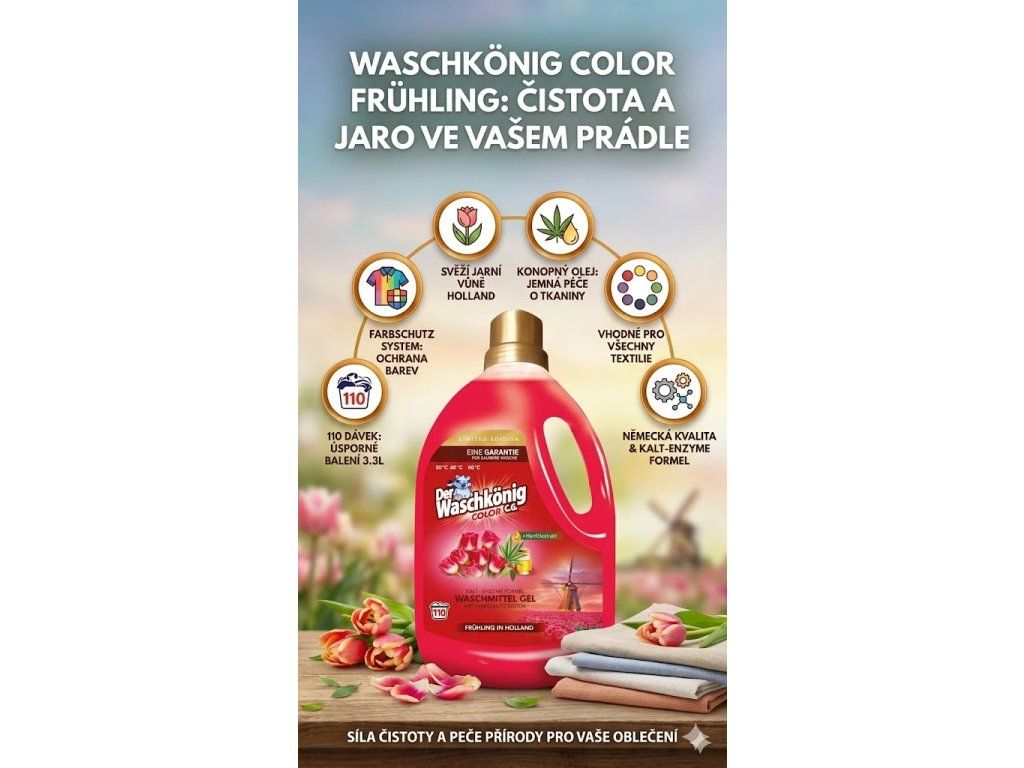 Waschkönig Prací gel Color Frühling In Holland je limitovaná parfémovaná verze německého pracího gelu, která vám přináší svěží vůni jara v Holandsku. Tento prací gel je inspirován květinovými tóny jarního období a nabízí nejen intenzivní čistotu, ale také dlouhotrvající vůni svěžesti. Jeho speciální složení s konopným olejem zajišťuje jemnou péči o tkaniny, čímž zachovává jejich krásu a chrání je před opotřebením. S tímto pracím gelem se každé praní stane radostí, a to jak pro vás, tak pro vaše oblečení.
