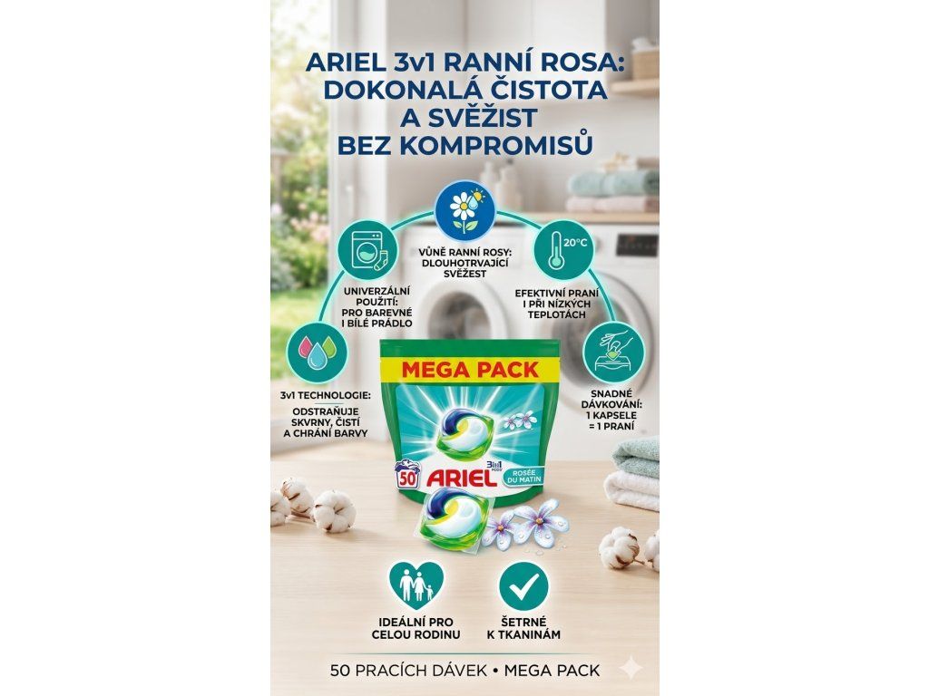 🧺 Ariel gelové kapsle 3v1 Ranní rosa universal 50 dávek pro čisté a svěže voňavé prádlo bez složitého dávkování
