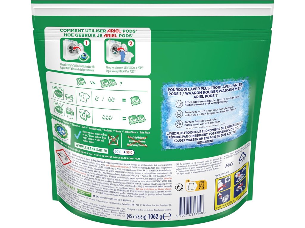 Detailní popis: Ariel gelové kapsle 4in1 Active Odor Defense Sport poskytují výjimečnou péči o vaše prádlo, a to díky své 4v1 technologii. Tyto kapsle kombinují účinné odstranění skvrn s dlouhodobou ochranou proti zápachu, což je ideální pro praní sportovního oblečení a barevných tkanin. Díky technologii Cool Clean dokážou kapsle Ariel vyčistit prádlo do hloubky i při nízkých teplotách, což přispívá k ochraně životního prostředí a snížení emisí CO2. Kapsle jsou snadno použitelné a zajišťují, že vaše prádlo bude nejen čisté, ale také svěže vonící až po dobu jednoho týdne. Balení obsahuje 45 dávek, což poskytuje dostatek praní pro vaše každodenní potřeby.