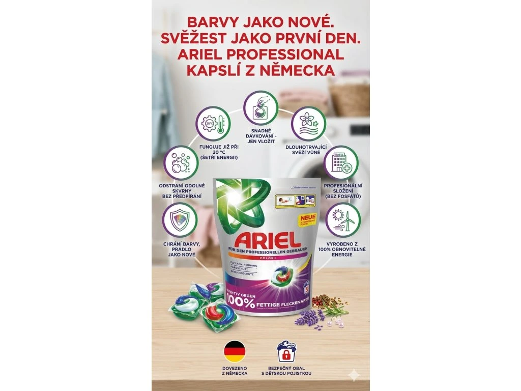Ariel je součástí portfolia světového lídra Procter & Gamble, ale své nejkvalitnější řady vyrábí exkluzivně pro německý trh. Produkty označené jako „Professional“ využívají technologie určené pro profesionální provozy – a jsou nyní dostupné i pro české domácnosti. V Česku běžně nedostupné – jen u nás.