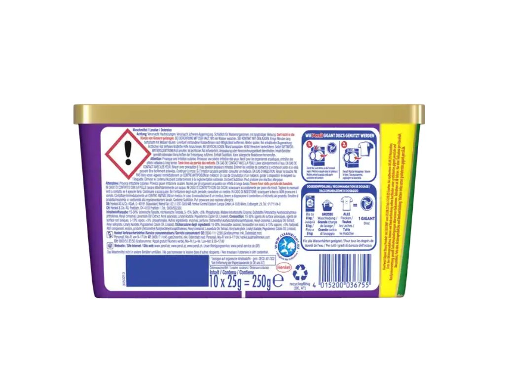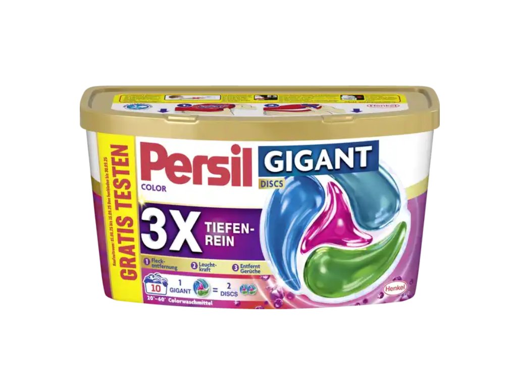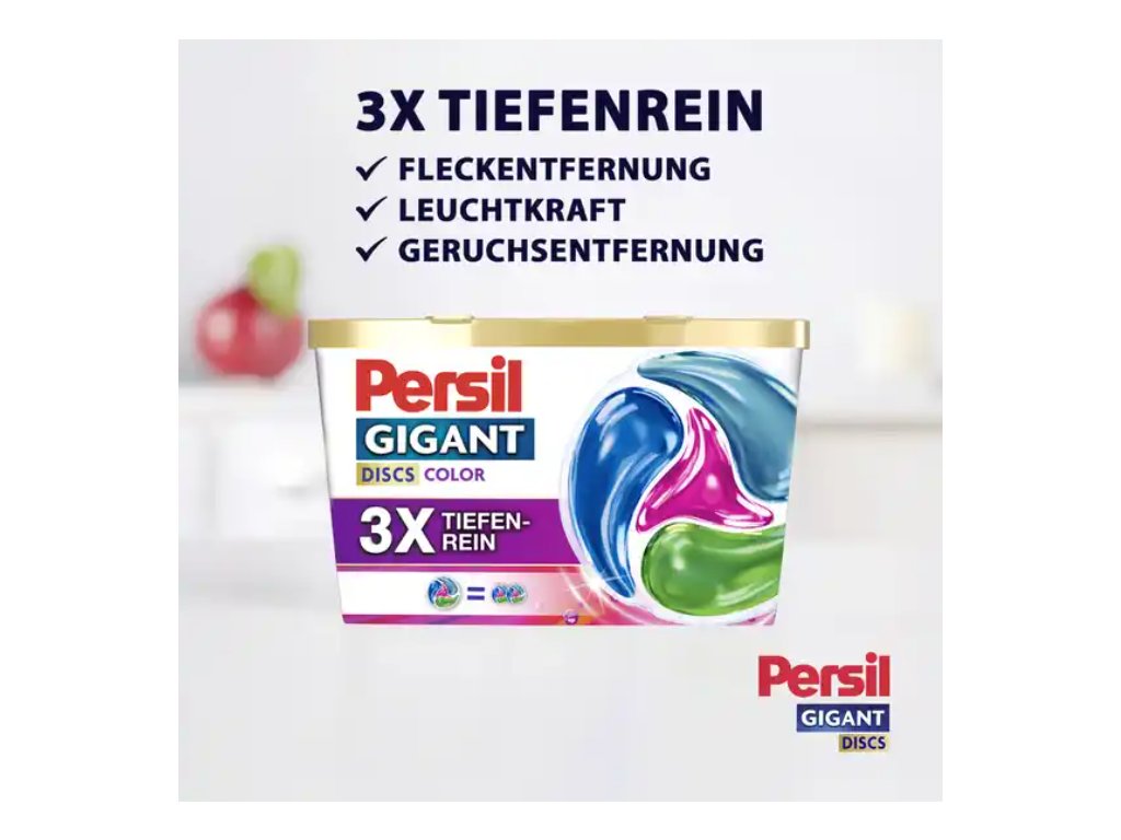 Chcete, aby vaše barevné prádlo zůstalo dlouhodobě syté, svěží a dokonale čisté? Persil Color Gigant Discs 3X Tiefenrein jsou speciálně vyvinuté kapsle pro barevné prádlo, které kombinují silné odstranění skvrn, ochranu barev a intenzivní neutralizaci pachů. Ideální pro velké náplně až do 8 kg – stačí vložit jednu kapsli do bubnu a o zbytek se postará Persil.