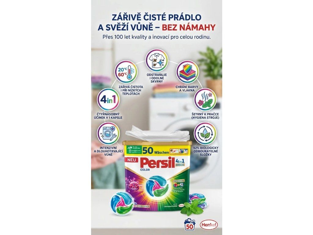 Chcete, aby vaše barevné prádlo zůstalo dlouhodobě krásně syté, čisté a voňavé – a to i při praní na nízké teploty? S revolučními Persil Color 4in1 DISCS získáte čtyřnásobný účinek v jedné dávce: dokonalé odstranění skvrn, hloubkové čištění vláken, ochranu barev a dlouhotrvající svěží vůni. Tyto prací kapsle jsou navrženy tak, aby si hravě poradily i s odolnou špínou a zároveň chránily vaši pračku před usazeninami a zápachem. Výsledkem je dokonale čisté prádlo – bez drhnutí, bez kompromisů.