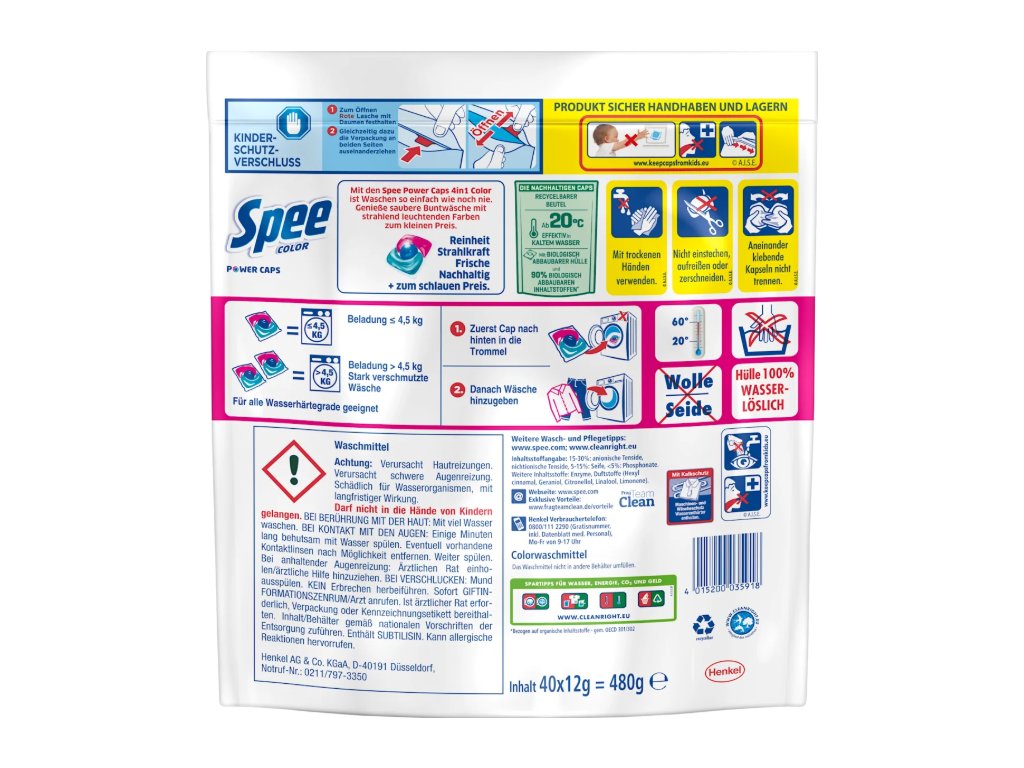 Snadné praní s perfektním výsledkem! Prací kapsle Spee Color Power Caps 4in1 jsou určeny pro barevné prádlo a nabízejí čtyřnásobný účinek: odstranění skvrn, ochranu barev, svěží vůni a jednoduché dávkování. 40 kapslí = 40 praní, účinné od 20 do 60 °C. Vyrobeno v Německu.
