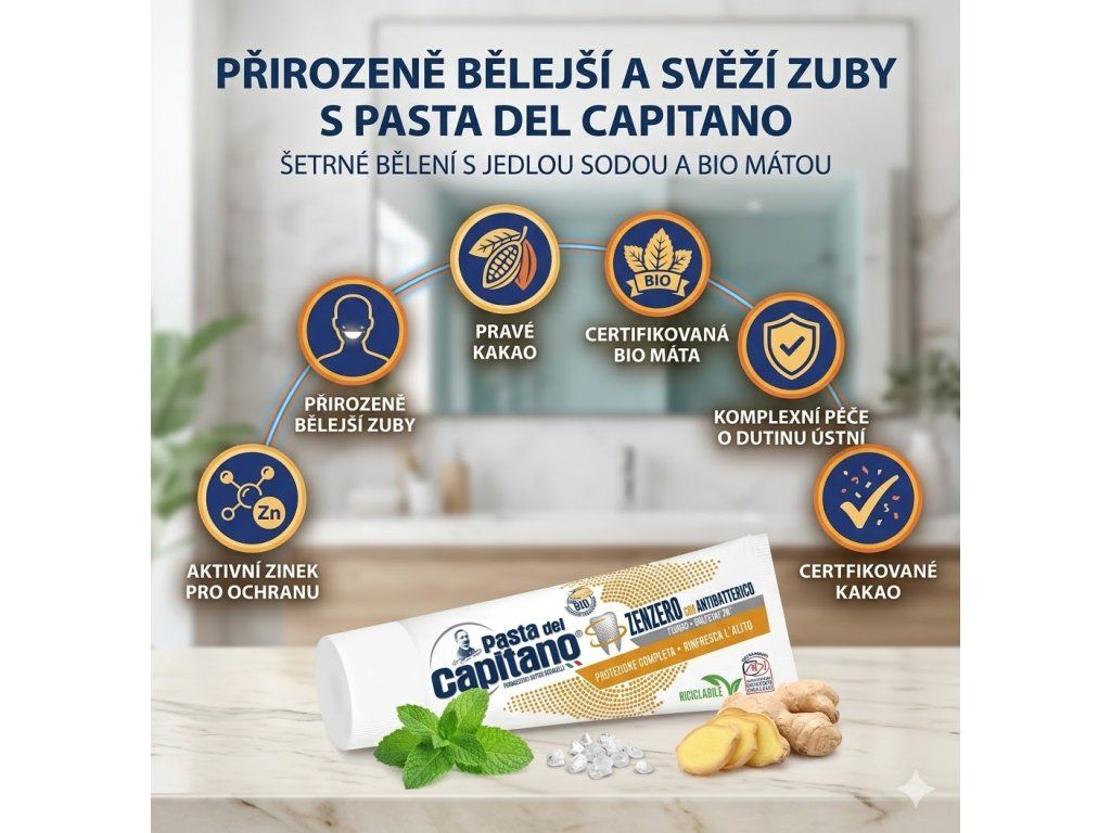 Hledáte zubní pastu, která bude spolehlivým základem každodenní hygieny pro vás i vaši rodinu? Pasta del Capitano Zenzero s BIO mátou přináší přesně tu rovnováhu, kterou v koupelně oceníte – důkladnou čistotu, antibakteriální ochranu a příjemnou svěžest bez zbytečné chemické zátěže. Už při prvním použití vás překvapí, jak jemně, ale zároveň účinně působí. Zanechává zuby hladké, ústa svěží a pocit čistoty, který vydrží mnohem déle než u běžných past. Je ideální volbou pro každodenní použití, kdy chcete mít jistotu, že pečujete o svůj úsměv kvalitně, šetrně a s důrazem na dlouhodobé zdraví zubů i dásní.