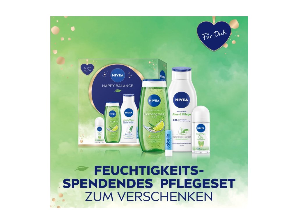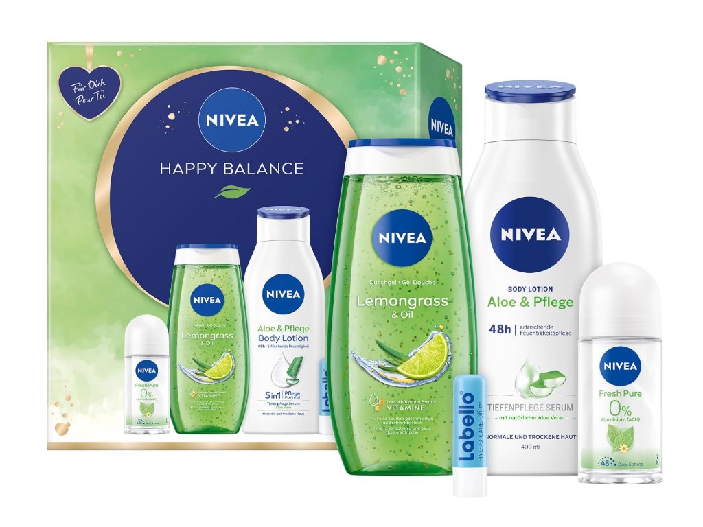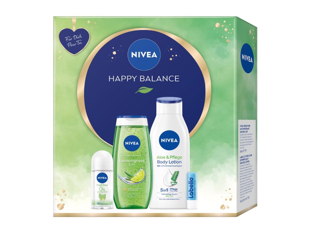 Nivea dárková sada Happy Balance – tělové mléko sprchový gel kuličkový deodorant a balzám na rty 1 ks - originál z Německa