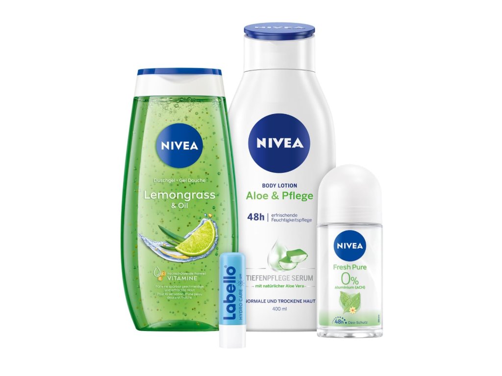 S touto sadou získáte kompletní tělovou péči od renomované značky Nivea. Sprchový gel Lemongrass & Oil s olejovými perlami jemně čistí, osvěžuje a zanechává kůži jemnou a provoněnou. Tělové mléko s aloe vera hydratuje pokožku až na 48 hodin a navrací jí hebkost. Deodorant Fresh Pure poskytuje spolehlivou ochranu bez alkoholu a balzám Labello Hydro Care s bambuckým máslem chrání rty před vysušením. Každý produkt má své místo ve vaší každodenní péči.