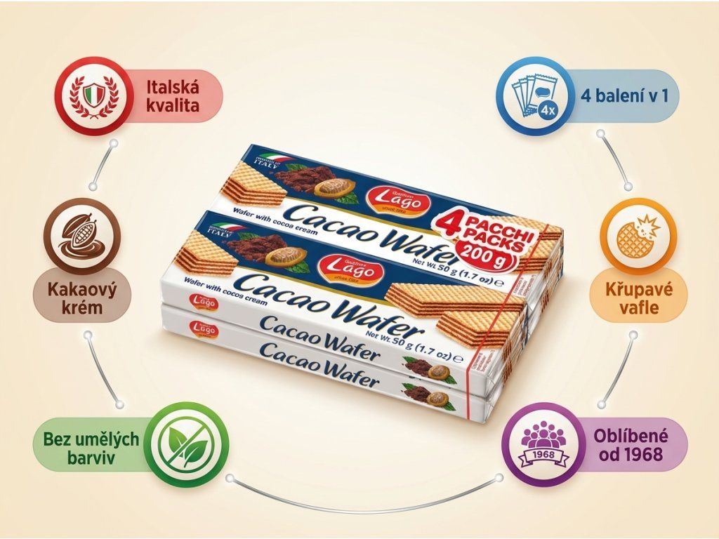 Tajemství spočívá v tom, jak italští cukráři z Gastone Lago kombinují lehce křupavé vafle s bohatou kakaovou krémovou náplní. Na rozdíl od obyčejných sušenek z českých supermarketů, tady cítíte skutečnou čokoládovou intenzitu — ne uměle naslazenou, ale plnou a přirozenou. Vrstvená struktura vafle zajišťuje ten charakteristický křup, který se líbí dětem i dospělým.