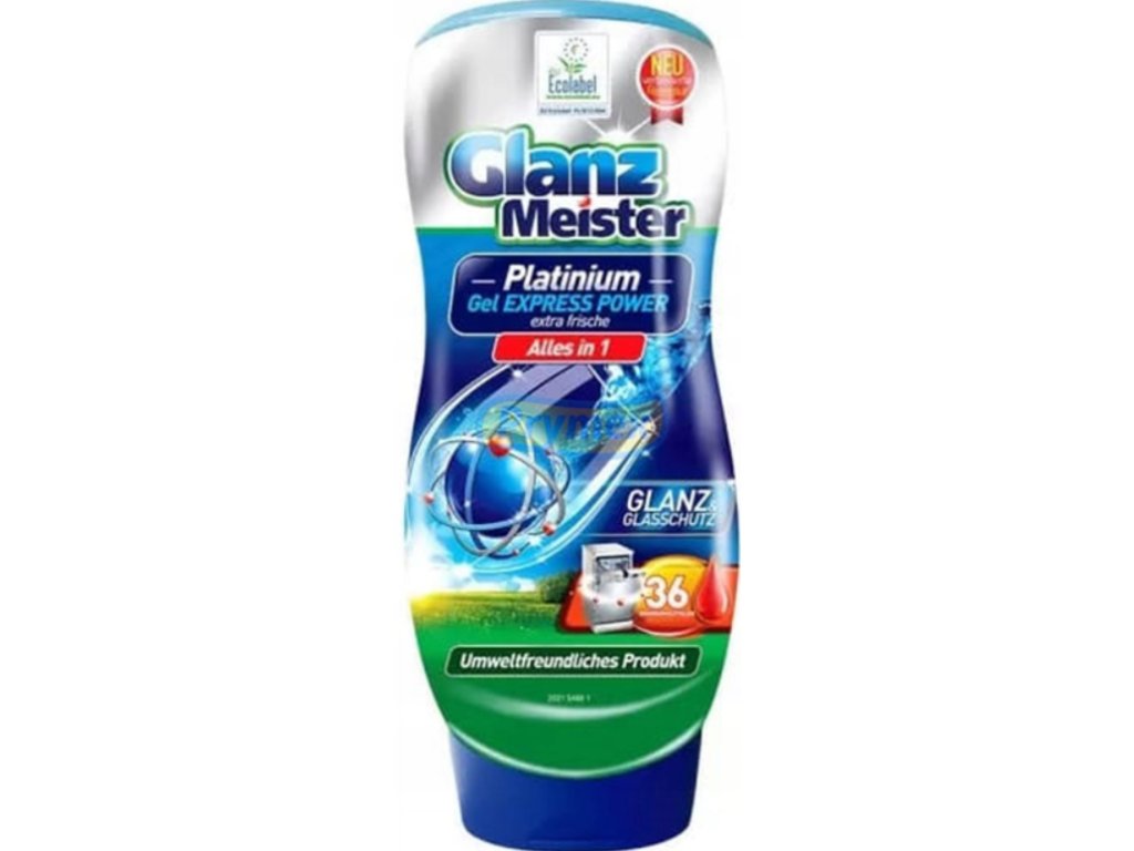 Glanz Meister Platinum Gel Express Power představuje novou generaci prostředků do myčky nádobí. Díky své koncentrované formuli Alles in 1 nabízí účinné mytí, ochranu skla a dokonale čisté nádobí již při krátkých programech. Gel je obohacen o extra fresh svěží vůni, která zanechává vaši myčku čistou a svěží.
