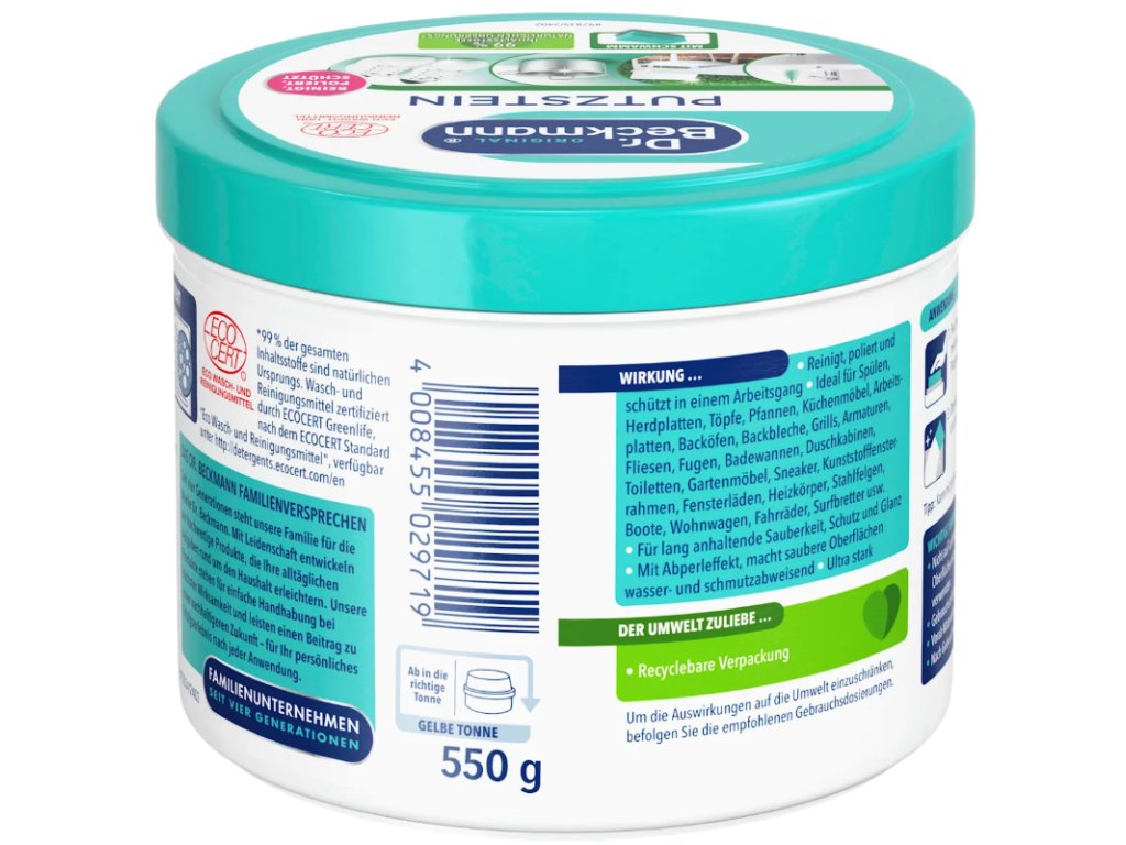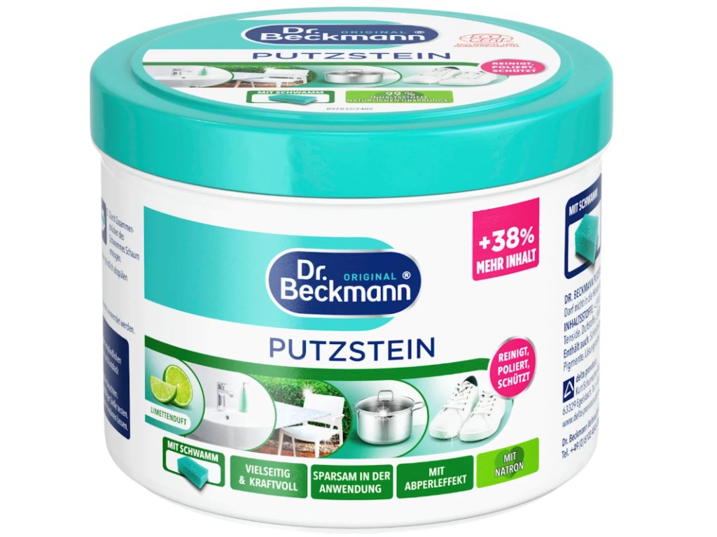 Dr. Beckmann Putzstein je víc než jen čistič. Je to multifunkční řešení, které se uplatní v kuchyni, koupelně, na zahradě i při údržbě sportovního vybavení. Účinně odstraňuje mastnotu, vodní kámen, zapečeniny i zašlé skvrny – bez námahy a bez poškození povrchu. Zanechává povrchy hladké, lesklé a chráněné před opětovným znečištěním.
