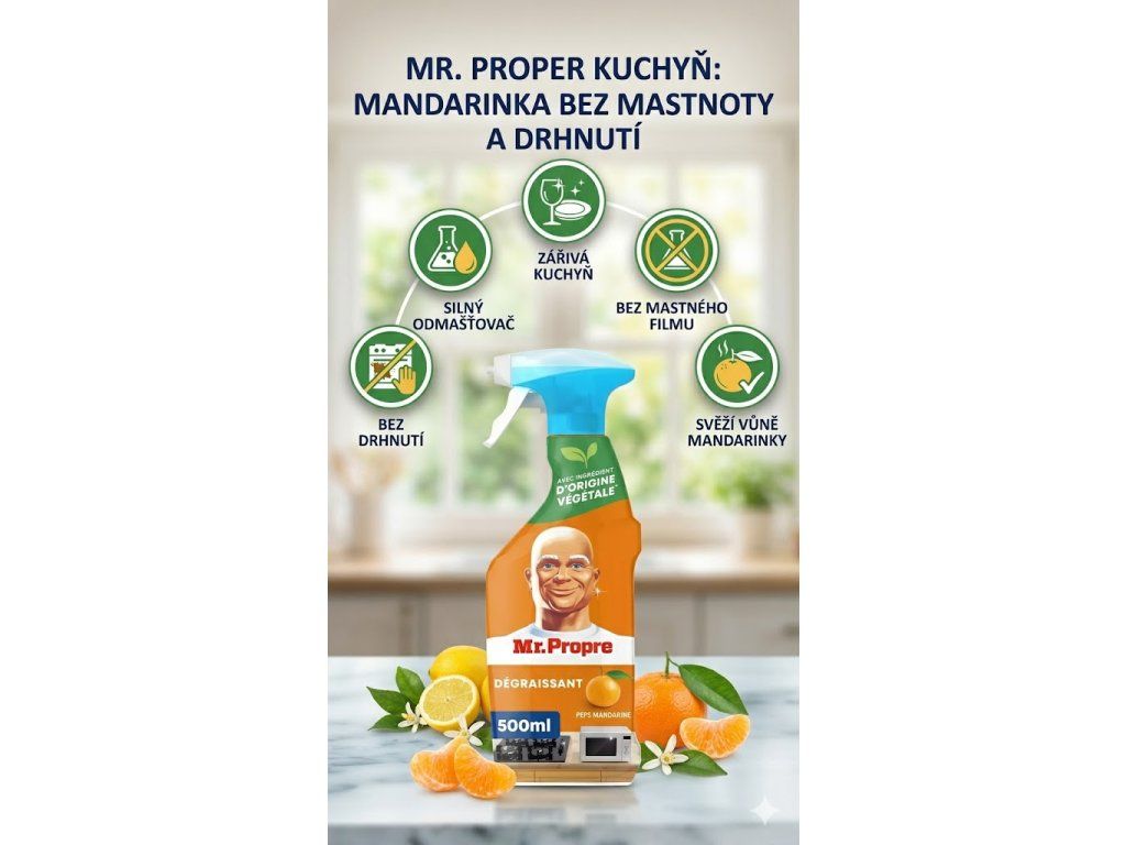 Už vás nebaví zdlouhavé čištění kuchyně a nekonečné drhnutí mastných povrchů? Mr. Proper odmašťovač kuchyně mandarin je přesně ten pomocník, který vám ušetří čas i energii. Díky své silné receptuře si poradí až se 100 % připálené mastnoty a odolných nečistot, a to bez zbytečné námahy. Stačí nastříkat, setřít a vaše kuchyň bude opět zářit čistotou a svěžestí.