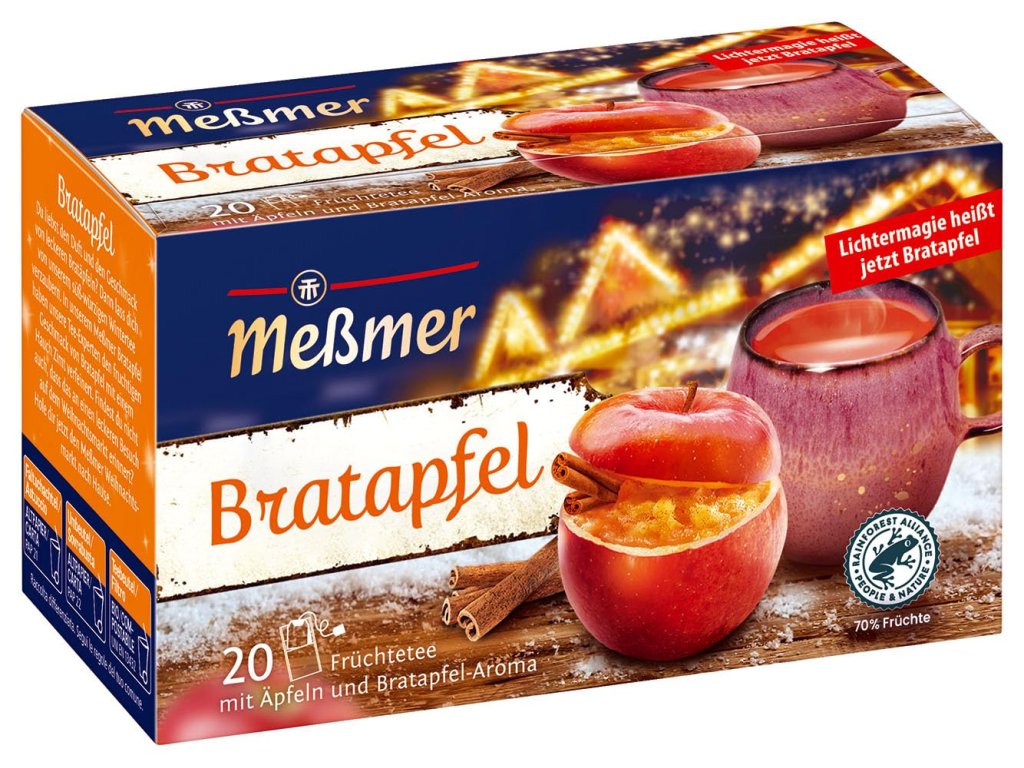 Milujete vůni čerstvého vánočního pečeného jablka a spojujete si ji s návštěvou vánočního trhu? Pak je pro vás naše nová odrůda to pravé. Protože našim odborníkům na čaj Meßmer se podařilo zachytit nezapomenutelnou chuť pražených jablek v lákavém čaji. Sladké pocity štěstí - šálek za šálkem. Vytvořeno společností Meßmer, milují ji všichni, kdo mají chuť na sladké. Každý okamžik se stává okamžikem vánočního trhu.