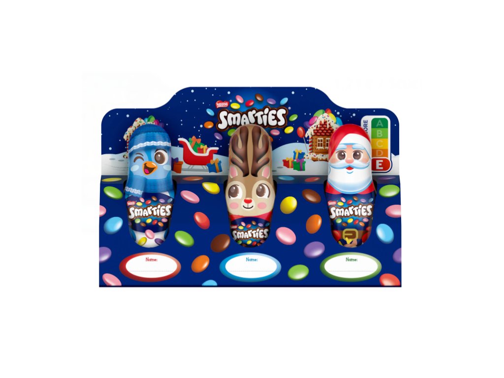 Duté postavičky Mikuláše a další postavičky z mléčné čokolády plněná mini čokoládovými "lentilkami".