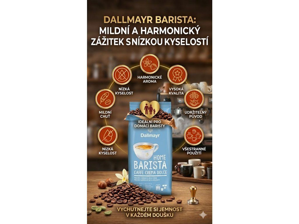 Dallmayr Barista Caffè Crema Dolce je zrnková káva, která přináší mildní a harmonickou chuť s nízkou kyselostí a jemným oříškovým aroma. Tato káva je ideální pro ty, kteří si rádi dopřávají kávu ve stylu Caffè Crema, a to buď čistou, nebo s mlékem. Dallmayr zaručuje kvalitní kávové zrna pěstovaná udržitelným způsobem a pečlivě pražená, aby se dosáhlo perfektní dávky chuti a krémovosti bez přílišné hořkosti.