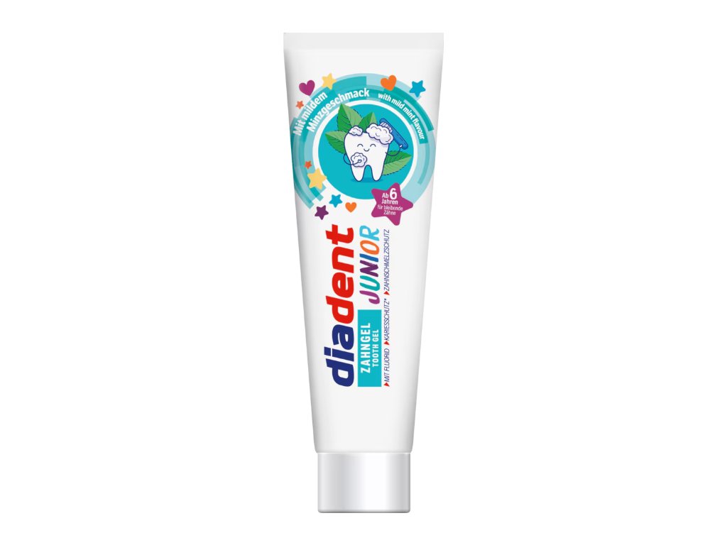 Diadent Junior zubní gel je vytvořen s ohledem na potřeby dětí od 6 let věku – tedy v čase, kdy mléčné zuby začínají nahrazovat zuby trvalé. Ty potřebují mnohem intenzivnější ochranu před zubním kazem. Tento gel obsahuje fluorid pro posílení skloviny, účinně odstraňuje zubní plak a zároveň chrání zubní sklovinu před kyselinami a kazem. Díky gelové konzistenci je příjemný na použití a dobře se roztírá. Jemná mátová příchuť potěší dětské smysly, aniž by působila příliš ostře. Vzhledem ke své vysoké německé kvalitě a bezpečnému složení se jedná o ideální zubní pastu pro každodenní péči ve školním věku.